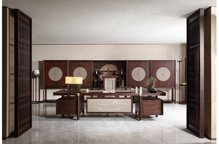 新中式觀水系列以水為設計源泉,古人云:水能載舟,亦能覆舟。水 ,自古以來在人們心里就占有一個比較重要的位置,這套班臺將傳統家具翹頭為桌面,寧靜如波瀾后的水平線,方正平直,內心澄明,盡顯人文風骨,同時,也為新貴們在使用過程起到一個心理提醒作用。水亦喻為“財”,寓示著財源滾滾,一帆風順,事業蒸蒸日上